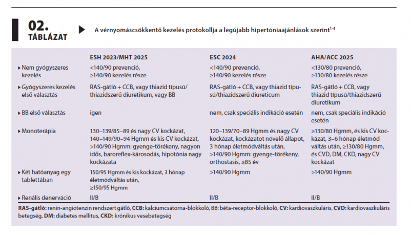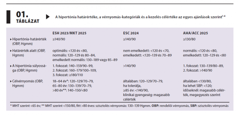 A közelmúltban számos nemzetközi és hazai ajánlás jelent meg a hiper­tóniával kapcsolatban. Az amerikai ajánlás 130/80 Hgmm-nél határozza meg a hipertónia küszöbét, míg az európai irányelvek továbbra is a 140/90 Hgmm-t tekintik határértéknek. Eltér a határérték alatti besorolás és a diagnózis megerősítésének módja (rendelőn kívüli mérés preferálása), a célvérnyomások meghatározása, a béta-blokkolók helye az első vonalbeli terápiában, továbbá a kombinációs stratégia felépítése. Jelen dolgozat ezeket az eltéréseket tárgyalja.