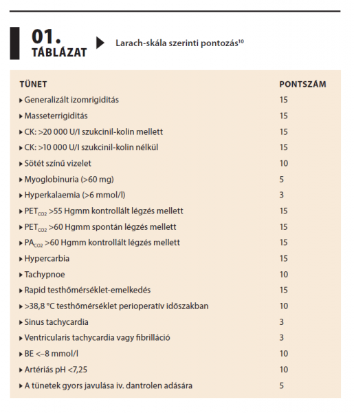 A malignus hipertermia autoszomális domináns módon öröklődő betegség, melynek lényege a szervezet inhalációs anesztetikumokra és depolarizáló izomrelaxánsra adott rapid testhőmérséklet-emelkedéssel jellemezhető hipermetabolikus válasza. Ezen vegyületek mindennapos használatban vannak műtétek, invazív beavatkozások során, így fontos ismernünk a páciens esetleges genetikai hajlamát a kórkép iránt. Diagnosztizálása során a Larach és munkatársai által javasolt klinikai skála kritériumait használjuk. A konzervatív kezelési lehetőségek mellett elérhető hatékony, megbízható gyógyszeres terápia is. A dantrolen alkalmazása óta a malignus hipertermia mortalitása 80%-ról 10% alá csökkent, a halálozási arány 5% alatti, köszönhetően az intenzív terápia fejlődésének, az intraoperatív monitorozásnak és a megfelelő gyógyszeres kezelésnek.
