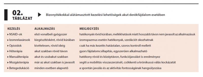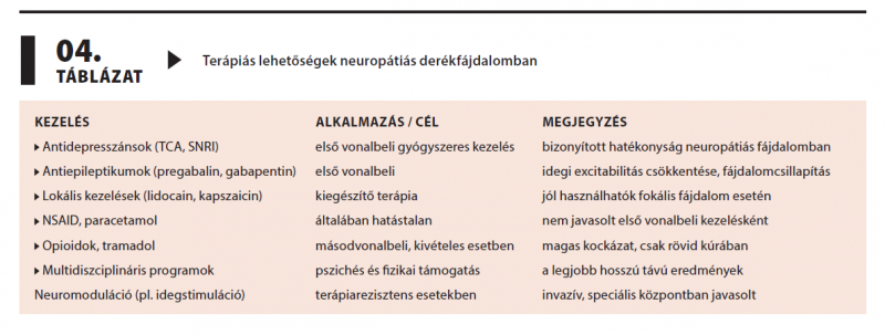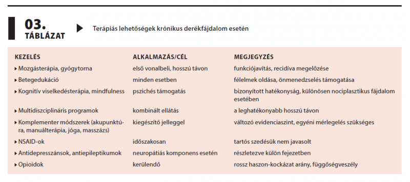 A derékfájdalom a leggyakoribb egészségügyi panaszok egyike, amely jelentős egyéni szenvedéssel, munkaképesség-csökkenéssel és társadalmi teherrel jár. A kórkép hátterében többféle mechanizmus – nociceptív, neuropátiás és nociplasztikus – állhat, amelyek aránya és kombinációja meghatározza a klinikai képet és a terápiás választ. Az akut derékfájdalom többsége spontán javul, ezért a túlkezelés kerülendő, míg a krónikus forma komplex bio-pszichoszociális megközelítést igényel. A neuropátiás és nociplasztikus komponensek felismerése különösen fontos, mert a hagyományos fájdalomcsillapítók gyakran hatástalanok. A multidiszciplináris, személyre szabott kezelés a funkcionális helyreállítást és az életminőség javítását célozza.
