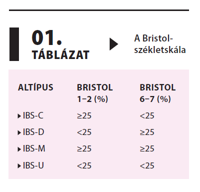 Az irritábilis bél szindróma (IBS) az agy-bél interakciók zavarával járó betegségcsoport egyik ismert, krónikus, relabáló tünetekkel jelentkező tápcsatornai kórképe, amely jelentős életminőség-romlással társulhat, és nagy terhet ró az egészségügyi ellátórendszerre. A jelenleg érvényben lévő Róma IV. kritériumrendszer szerinti pozitív diagnosztika, a Bristol-székletskála szerinti altípus-besorolás, valamint a személyre szabott, interdiszciplináris terápiák alkalmazása elősegíti az optimális betegellátást. Magyarországon a legutóbbi, 2024-ben megjelent irányelv segíti a diagnosztikát és a terápiát.