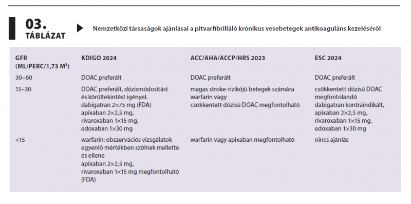 A pitvarfibrilláló betegek tartós antikoaguláns kezelésére K-vitamin-antagonistákat vagy direkt orális antikoaguláns készítményeket (DOAC) alkalmazhatunk. Jelen összefoglalóban e gyógyszerek használatát mutatjuk be krónikus vesebetegek esetében.