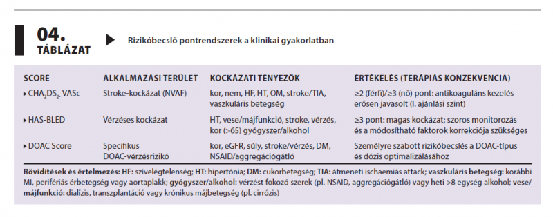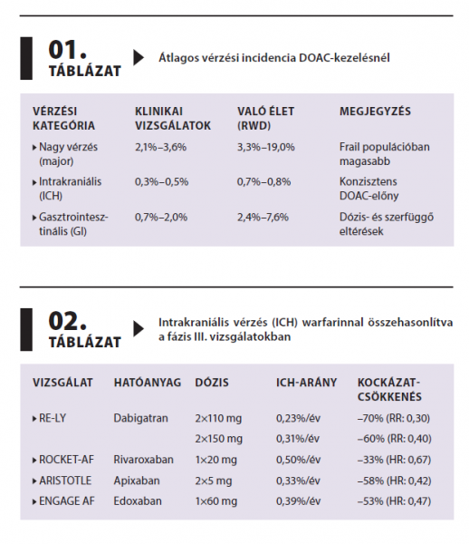 A direkt orális antikoagulánsok (DOAC-ok) alkalmazásakor előforduló vér­zéses komplikációk a legsúlyosabb mellékhatások közé tartoznak. A vér­zések számának minimalizálását segíti a helyes indikáció, a rizikótényezők dinamikus újraértékelése score-rendszerek segítségével.